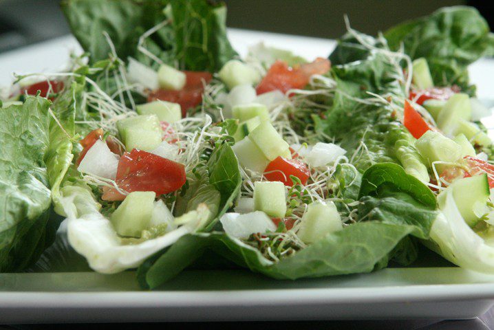 Luego coloca las hojas de la lechuga lavada y pon un poco del paté en cada una. A continuación pon todos los demás ingredientes – los tomates, el pepino, la cebolla, el yogur y los berros. ¡Disfruta!